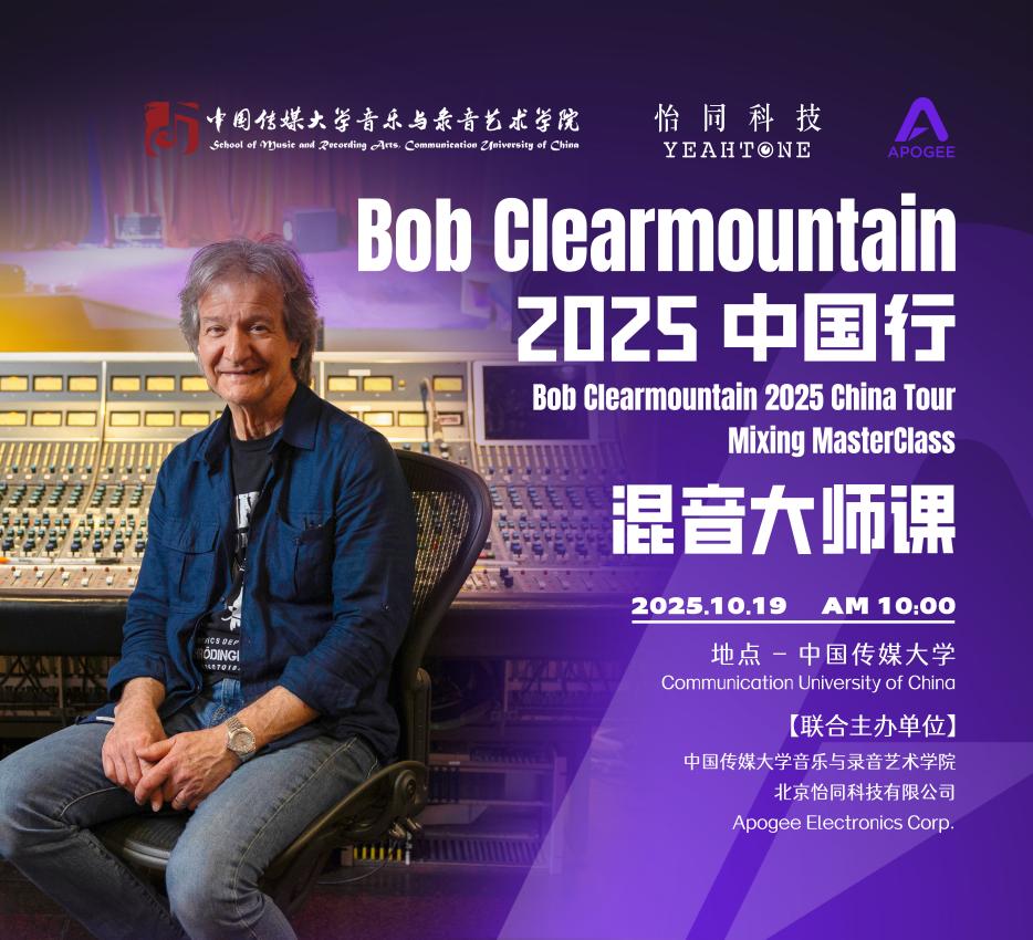 2025年10月19日(周日),中国传媒大学音乐与录音艺术学院联合北京怡同科技有限公司、Apogee Electronics Corp主办世界著名混音艺术家、录音工程师Bob Clearmountain 2025中国行活动。