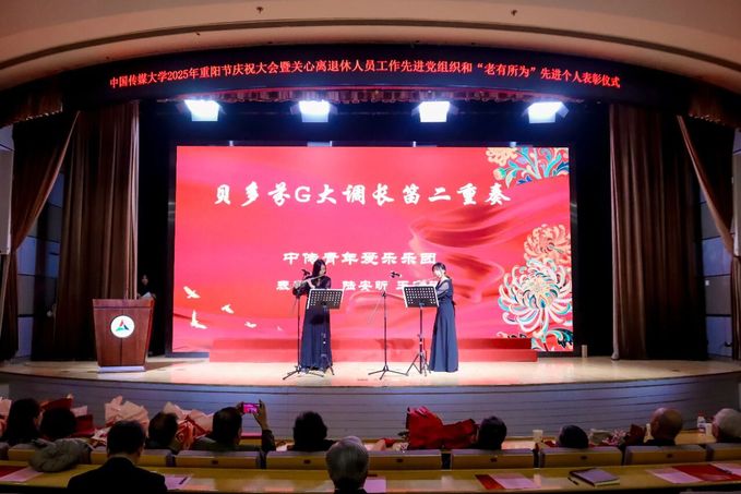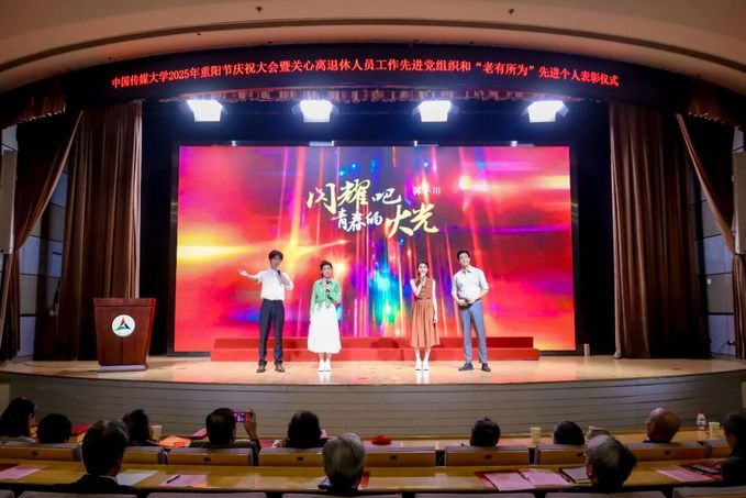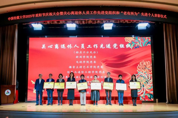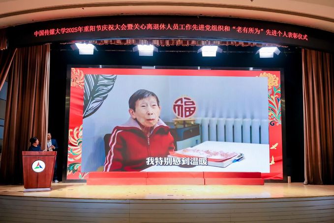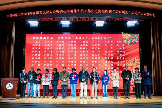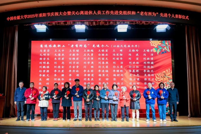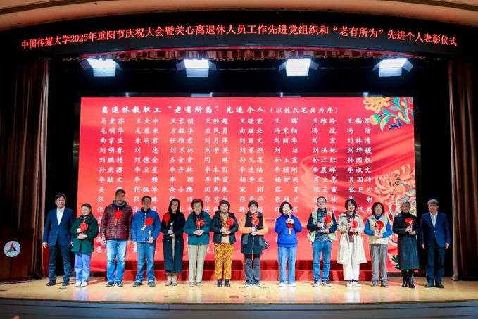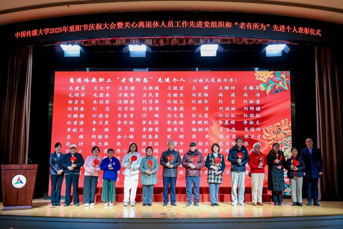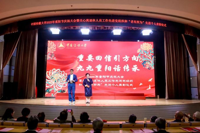 (通讯员 赵家仪 摄影 李思琪 刘恩华)10月29日上午,中国传媒大学2025年重阳节庆祝大会暨关心离退休人员工作先进党组织和“老有所为”先进个人表彰仪式在中传讲堂举行。党委书记廖祥忠,党委副书记张绍华,党委副书记、纪委书记郑鹏,党委常委、副校长李新军、王晖,党委常委、组织部部长徐红梅、校务委员会执行主任张根兴出席庆祝大会。二级党组织主要负责同志,党政职能部门、直(附)属单位主要负责人参会。大会由退休教师陈雅丽、青年教师魏博伦主持。