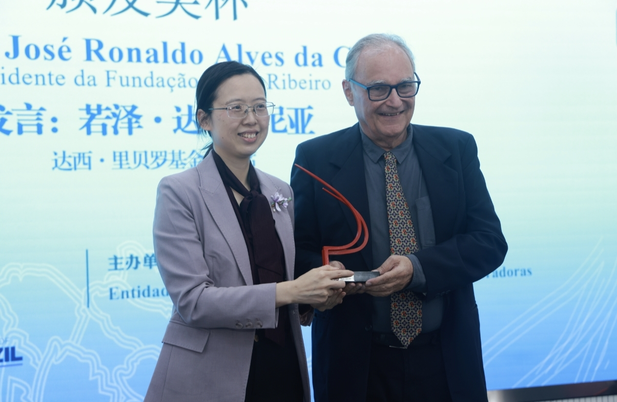 接着,若泽·达·库尼亚向《巴西人》中文版译者颜巧容副教授授予感谢信与奖杯,并向为本次活动提供支持的裴若涵致谢。