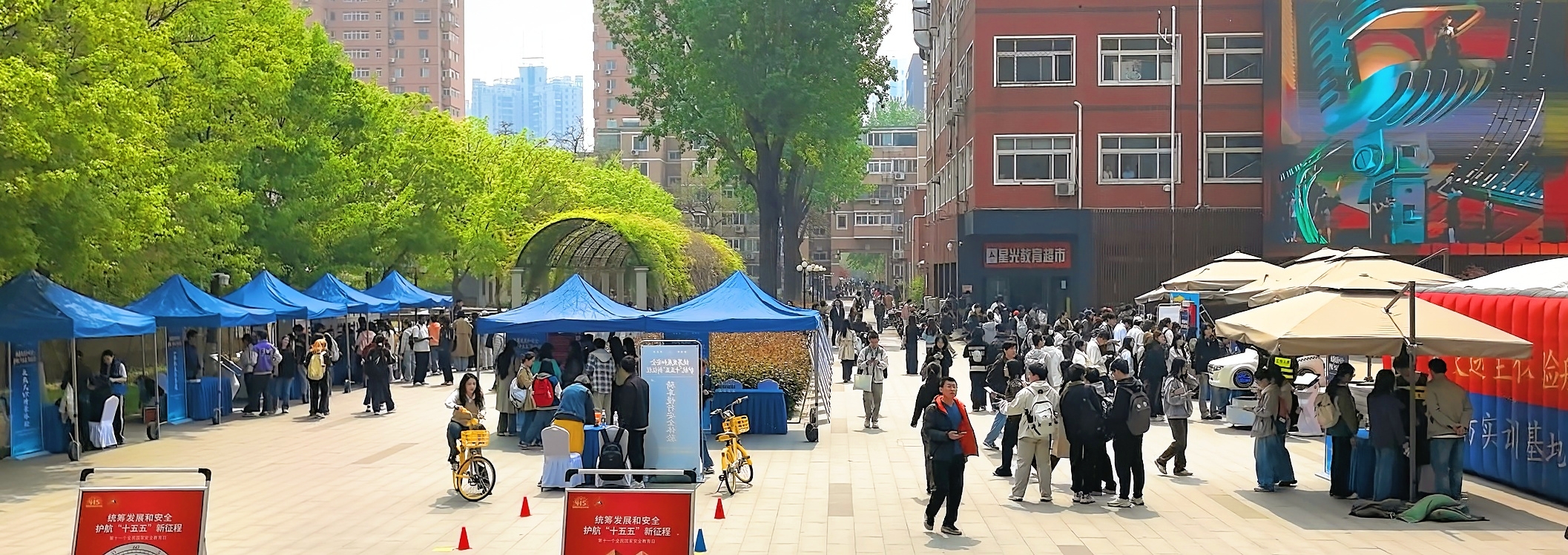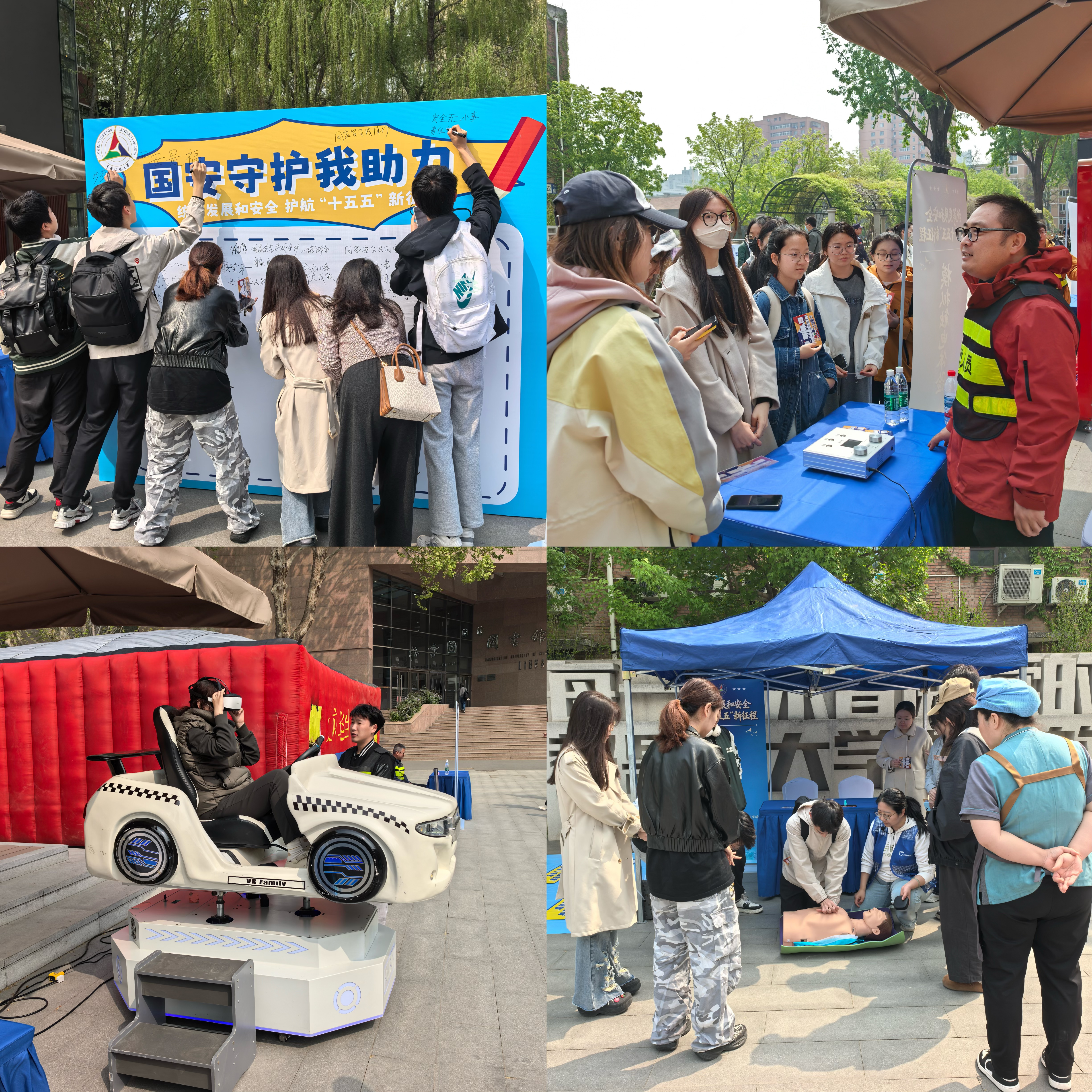 本次“4·15”全民国家安全教育日线下实训活动,采用集章通关参与的模式,聚焦国家安全、反诈防范与日常安全防护,打造多元化互动体验场景。活动设置国安签名墙、国家安全大转盘、VR 反恐情景体验、一体机反诈答题、反诈心得我来套等互动环节,以及心肺复苏训练、模拟触电体验、骑车慢行安全体验、VR 交通设备体验区等实训项目,让师生在签名寄语、随机答题、沉浸式反恐逃生体验中深化对总体国家安全观的理解,树立“国家安全、人人有责”的责任意识;通过线上答题、套圈互动等趣味形式拆解诈骗套路、普及反诈知识;在实操实训中掌握急救技能、安全用电知识与交通安全规范,全方位提升日常安全防护与应急自救能力。