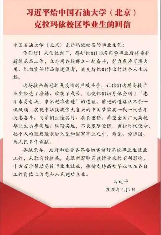 (通讯员 陶凯伦)7月7日,习近平总书记给中国石油大学(北京)克拉玛依校区毕业生回信,肯定他们到边疆基层工作的选择,对广大高校毕业生提出殷切期望。寄语他们要把个人的理想追求融入党和国家事业之中,为党为祖...