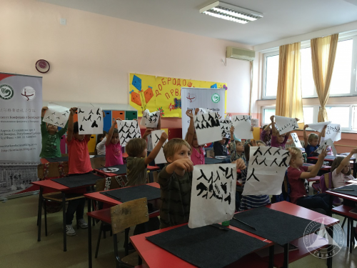 而在Mihailo Petrovic Alas小学和Kralj Petar Prvi小学,书法体验活动也开展得有声有色。当老师向小学生们介绍,中国的汉字大部分是象形字,比如“人”就是站立的形象时,孩子们惊呼,“中国人真聪明!中国的汉字真有意思!”学生们第一次手执笔墨,在宣纸上一笔一画地写下“人”“日”“山”等汉字,还不时和左右同学比赛看谁写得好。体验课结束了,孩子们走出课堂,立刻活学活用,用一句“你好”、“再见”向中国老师致意。