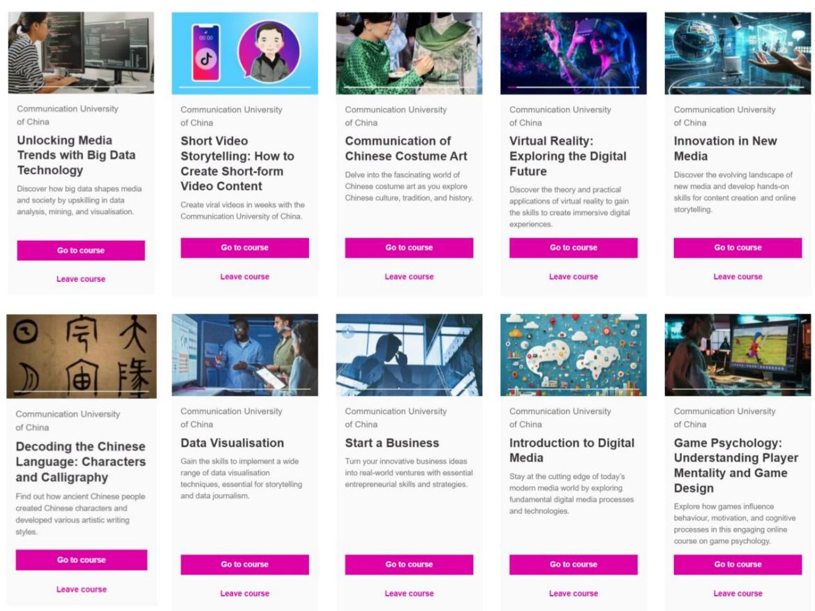 此次上线的首批课程涵盖我校多个优势学科领域,包括《数字媒体技术导论》《短视频叙事技巧》《中华服饰艺术传播》《数据可视化》《解读中文语言:汉字与书法》《游戏心理学》《新媒体编创》《创业学》《媒体大数据挖掘》《虚拟现实探索数字未来》。