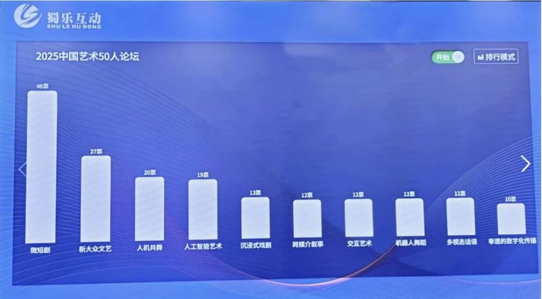 与会专家进行现场投票,根据实时票数,现场发布10个年度热词。其中,由中国传媒大学提议征集的“微短剧”“跨媒介叙事”“多模态话语”3个名词入选“2025年中国艺术热词”。