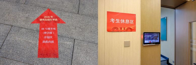 为了方便考生参加考试,招生处通过中传研招网、中传研招微信公众号等多渠道,提前向考生发布了《中国传媒大学考点考生须知》、存包服务指南与安检注意事项等。考试期间,校园内张贴了路线指引标识,帮助考生提前了解考场分布及考区情况。考场立德楼一层设置了考生休息区,学校食堂提供了多种餐饮选择,为考生提供免费热水。校医院工作人员全程保障。