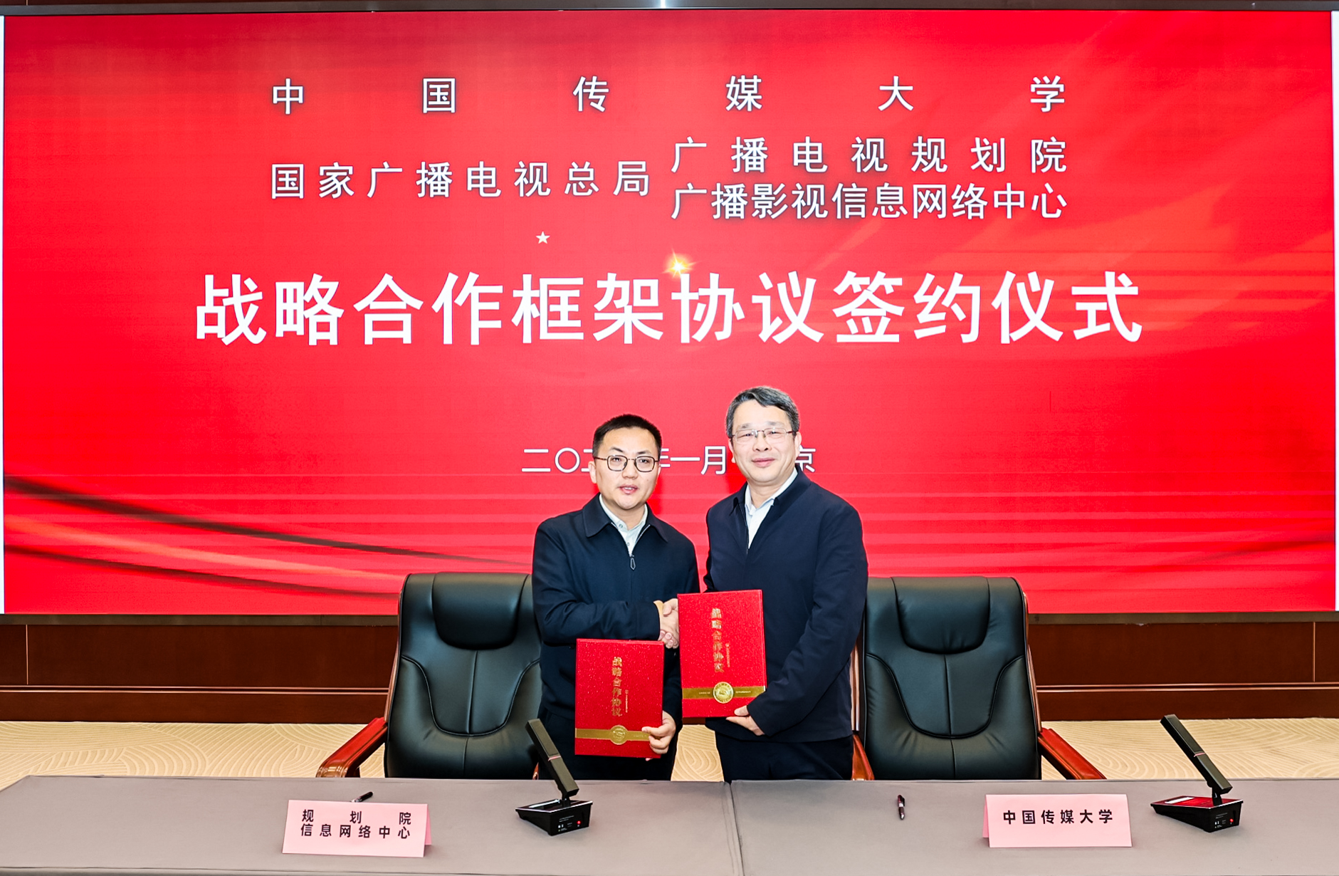 1月30日,中国传媒大学与国家广播电视总局广播电视规划院、广播影视信息网络中心战略合作框架协议签约仪式在北京举行。中国传媒大学校长张树庭、副校长王晖,广播电视规划院院长、广播影视信息网络中心主任冯景锋,广播影视信息网络中心副主任邓向冬,广播电视规划院副院长滕勇出席签约仪式。