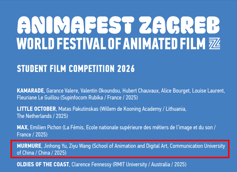 (通讯员 张若琦)3月11日,2026萨格勒布国际动画节(World Festival of Animated Film - Animafest Zagreb)官方网站发布入围名单,我校动画与数字艺术学院2021级动画专业学生余金泓、王子瑜的作品《喃喃低语》(Murmure)从来自全球95个国家和地区的2055部作品中脱颖而出,入围学生影片竞赛单元(Student Film Competition),这也是入围本届节展该单元唯一一部中国内地作品。