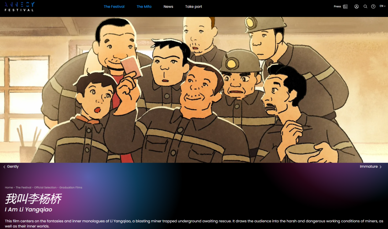 昂西国际动画节创办于1960年,与萨格勒布国际动画节、渥太华国际动画节并称全球三大顶级动画节,也是其中历史最悠久和影响力最大的节展,被誉为“动画界的戛纳”,其下设的动画长片、动画短片、电视动画等奖项被视为国际动画界的最高荣誉,毕业影片单元更是备受瞩目的全球优秀学生作品的展示平台。2026年,动画节将于6月21日至27日在法国昂西举办,届时,《我叫李杨桥》将在当地展映并角逐最终奖项。