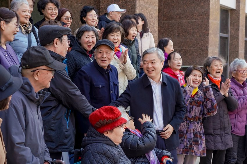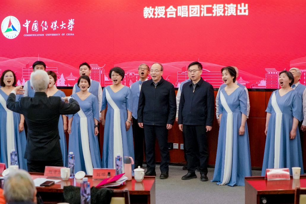 学校教授合唱团带来精彩的汇报演出,精神矍铄、歌声嘹亮,展现了昂扬向上的精神风貌和深厚的艺术素养,现场气氛温馨热烈。教授合唱团邀请学校领导和在场全体人员一同演唱校歌《校园里有一排年轻的白杨》。